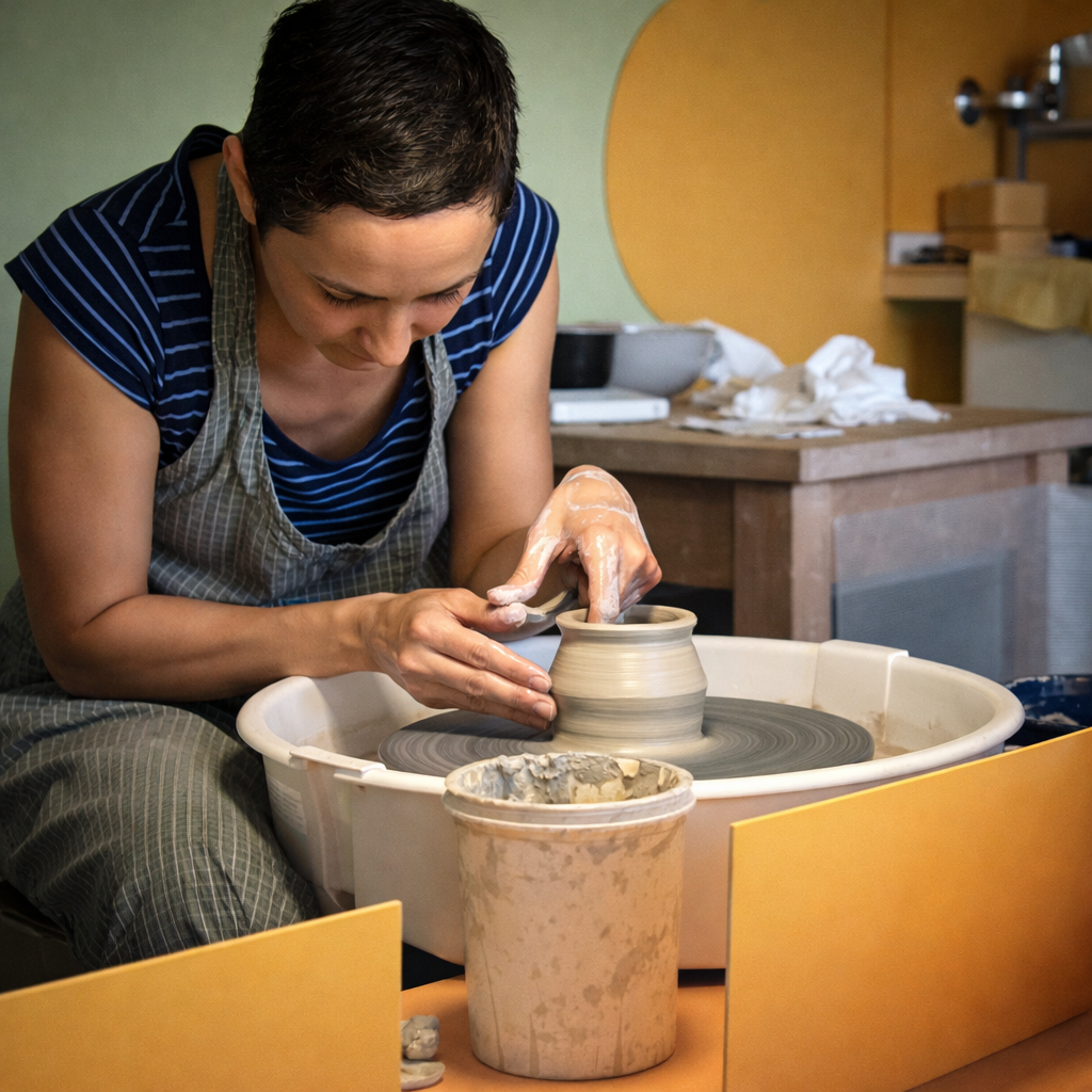 Diplômée Maestro d’Arte en céramique à l’École F. Faccio (Italie) en 1993, puis titulaire d’un Master en architecture de l’Université de Turin (1999), j’ai très tôt développé une approche transversale entre arts, matière et conception de l’espace. Après une expérience professionnelle dans un atelier de céramique renommé au Nouveau-Mexique (États-Unis), auprès du potier britannique Andrew Sanders, je me suis installée en Suisse en 2005, où j’exerce depuis comme potière professionnelle.