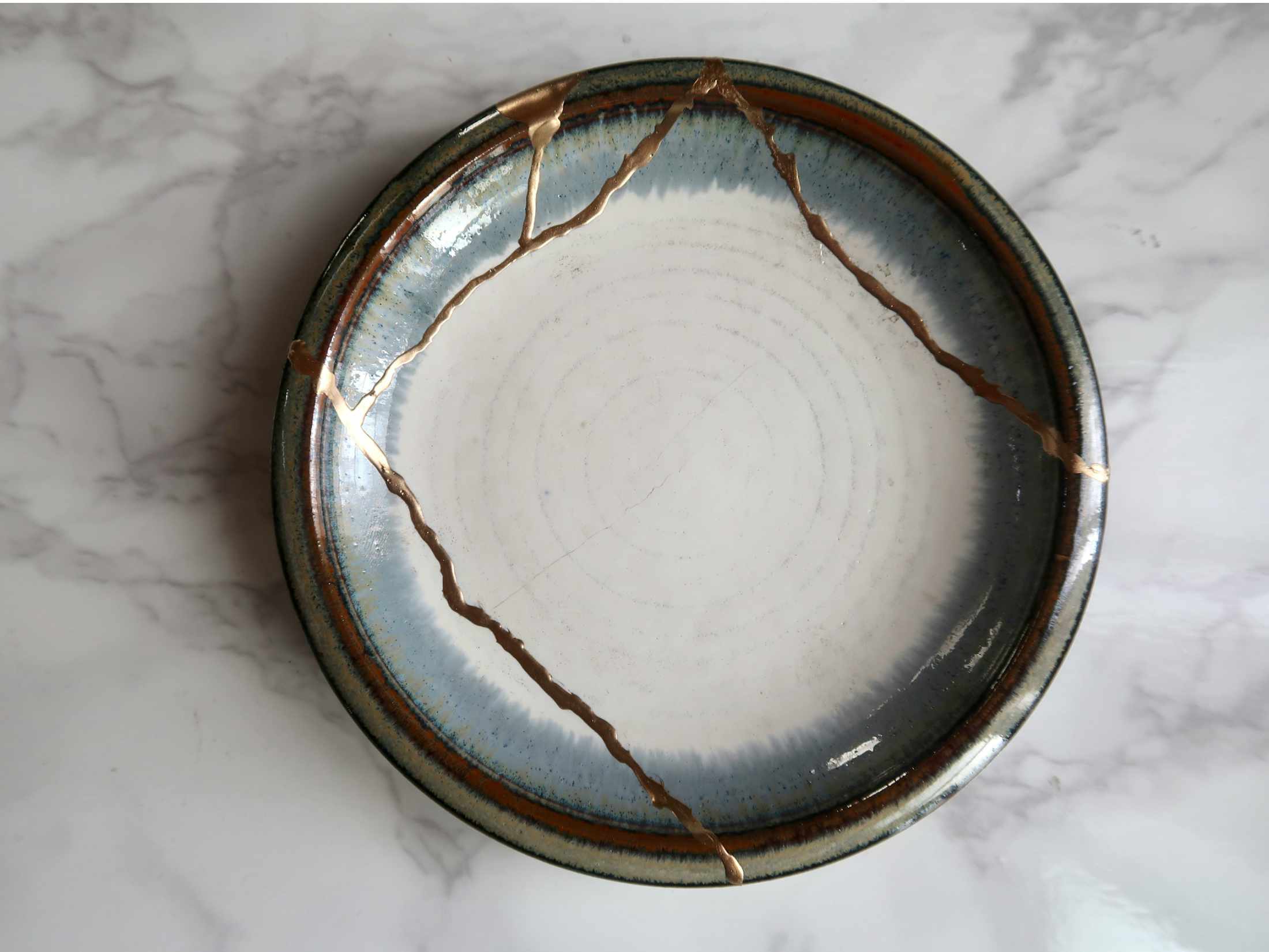 Le kintsugi est une technique japonaise de réparation de la céramique consistant à restaurer les pièces brisées à l’aide de laque mélangée à de la poudre d’or, d’argent ou de platine. Plutôt que de masquer les fractures, le kintsugi les met en valeur, transformant l’objet réparé en une pièce unique où la trace de l’accident fait partie de son histoire.